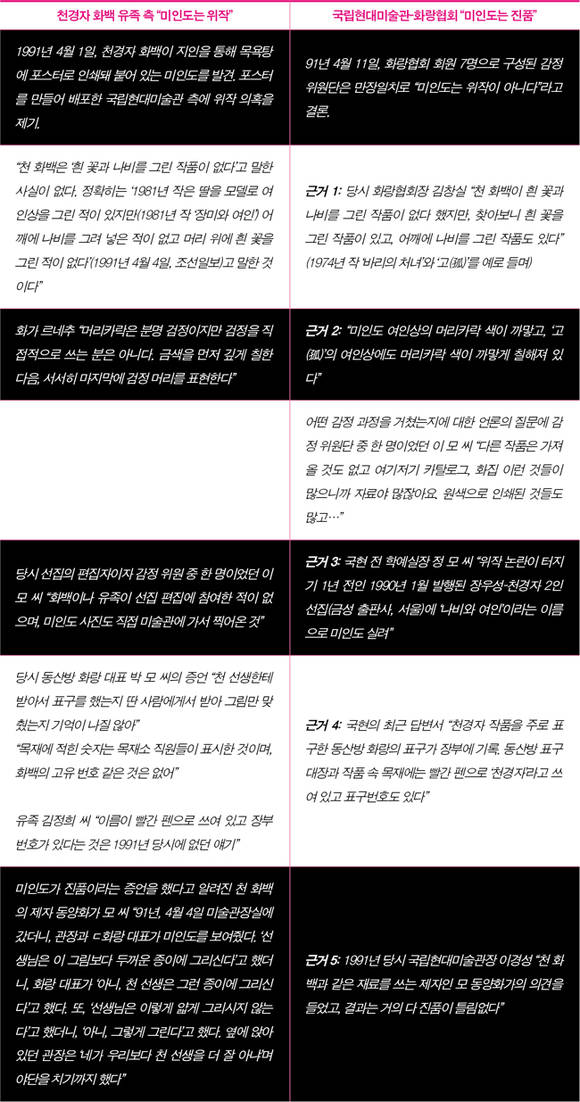방송 내용을 바탕으로 미인도 위작 논란의 전개 및 국현과 화랑협회 vs. 천 화백 유족의 입장 차이를 한 눈에 알기 쉽게 표로 정리해봤다.