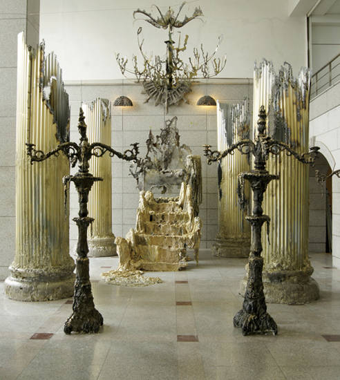 (CNB저널 = 김연수 기자) 오래전에 잊혀져버린, 유럽 어느 한구석엔가 있었을 작은 나라 왕의 접견실이 여태껏 남아있다면 이런 모습일까. 계단을 올라서야만 앉을 수 있는 높은 의자와 앙상한 뼈대만 남은 샹들리에. 주위를 둘러싼 그리스 신전을 닮은 기둥들과 거대한 촛대는, 세월이 불길인양 또는 동굴의 종유석인양 부식되고 마모되고 쌓이기를 반복한 모습이다. 변화무쌍한 세월을 겪은 듯한 형상들의 표면에 남은 황금빛은 한때 영화로웠던 순간을 애써 상징하는 듯하다.