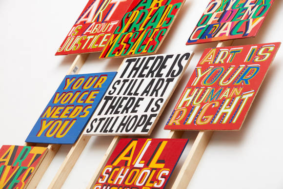 ‘슬로건 아트’로 알려진 밥 앤 로버타 스미스는 기성 사회의 규범과 가치에 도전하는 배너, 포스터를 전시한다. 그의 배너를 보면 ‘예술은 당신의 인권입니다’ ‘아직 예술이 있습니다. 아직 희망이 있습니다’ ‘아트는 메시지를 퍼뜨립니다’ 등의 문구가 눈에 띈다. 그는 모든 개인이 자신의 창의력으로 예술과 사회에 발언하기를 독려한다. 이 배너들은 지난해 광장을 뒤덮었던 한국 예술인의 조형물, 포스터 또한 떠올리게 만든다. 즉, 이 공간은 영국 사회에 울려 퍼졌던 또 하나의 광장 예술을 구현한 것이라고도 할 수 있다.