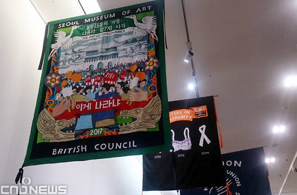이 가운데 특히 전시명 ‘불협화음의 기술: 다름과 함께 하기’와 더불어 ‘이게 나라냐’ ‘자유’ ‘평등’ ‘촛불’ 글씨를 든 사람들의 모습을 담은 깃발이 눈에 띈다. 이는 에드 홀의 작업이다. 박 큐레이터는 “전시는 지난해 4월부터 준비에 들어갔다. 전시 준비 과정 중 한국 사회를 뒤흔드는 일이 생겼고, 이 일에서 시선을 돌릴 수가 없었다. 자연스럽게 전시에도 스며들었다”며 “전시 참여 작가 중 에드 홀이 광장을 보고 새롭게 배너 깃발을 만들었다. 영국 사회와 관련된 다양한 작업과 더불어 한국 상황도 살피면서 불협화음이 일어나는 현장들에 주목한 결과”라고 말했다.