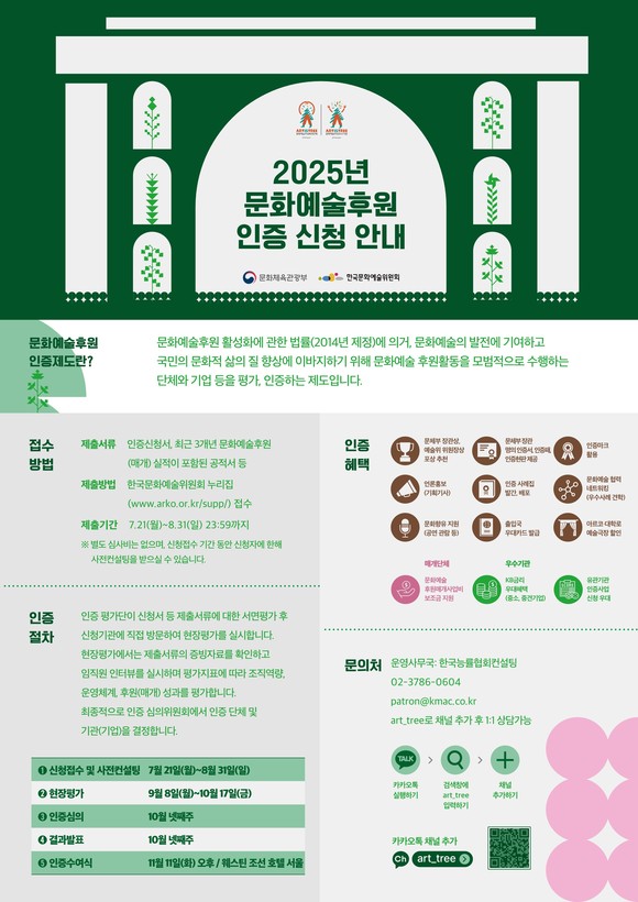 문화체육관광부(장관 유인촌, 이하 문체부)와 한국문화예술위원회(위원장 정병국, 이하 아르코(ARKO))는 모범적인 문화예술후원 활동을 펼친 비영리법인과 기업(기관)을 대상으로 ‘문화예술후원매개단체’ 및 ‘문화예술후원우수기관’ 인증 신청 접수를 시작한다. 신청은 오는 8월 31일까지, 아르코 누리집에서 가능하다.