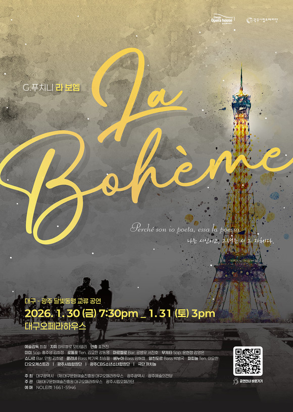 2026년 새해, 대구오페라하우스는 광주시립오페라단 제작의 푸치니 오페라 〈라 보엠〉을 1월 30일(금)과 31일(토) 양일간 선보일 예정이다. 이번 공연은 달구벌 대구와 빛고을 광주가 문화예술·산업·관광 등 다양한 분야에서 상생과 연대를 이어가는 광역 교류 프로젝트 ‘달빛동맹’의 일환으로 마련되었으며, 지역 간 문화 네트워크 확장과 예술교류 활성화를 목적으로 추진되고 있다.