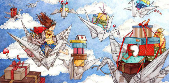 송지혜, '세상의 모든 선물: 선물이 하늘에서 떨어진다면(If Presents Fell From The Sky)'. 디지털 프린팅, 페이퍼 커팅, 셰도우 박스, 60 x 120cm. 2016.