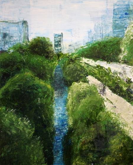 작가는 이런 풍경이 ‘일상의 사건과 사물들을 통해 느낄 수 있는 세계’며, ‘이성과 직관사이에 존재하는 이미지’라고 설명한다. 순간을 기록한 사진과 작가의 기억, 그리고 주관적 인상을 종합한 풍경이미지는 주걱을 이용해 물감을 뒤섞는 추상적 방식과 재현의 방식이 혼합돼 표현된 결과다. 그의 의도와 우연적 표현이 뒤섞인 것이다.