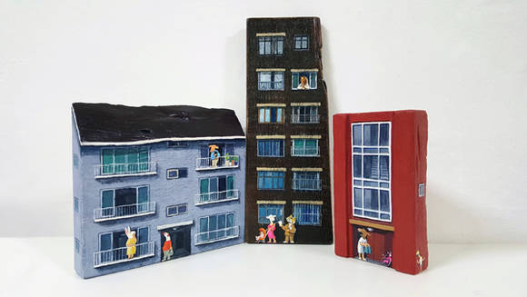 나인주, (왼쪽부터)'마을 - 반려(伴侶)'. 25 x 20 x 4cm. / '영업'. 15 x 38 x 3cm. / '어디 있는 거야'. 12 x 19 x 5cm, 나무에 아크릴릭 페인트. 2016.