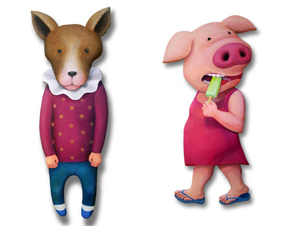 나인주, (왼쪽)'개(Dog)'. 29.3 x 90.5 x 2.5cm. / '돼지(Pig)'. 30.5 x 70.3 x 2.5cm. 나무에 아크릴릭 페인트. 2017.