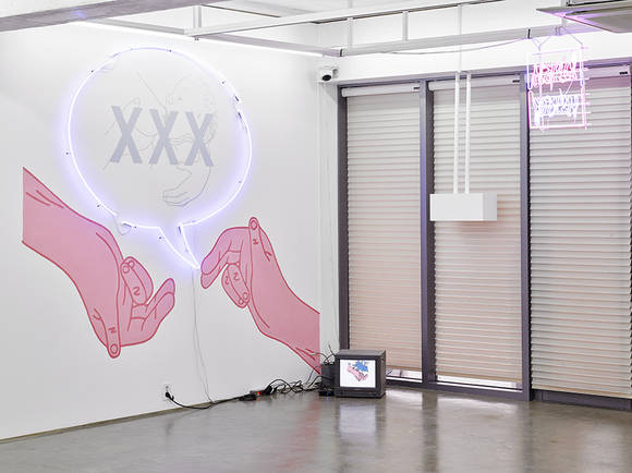 그는 기존의 작업 방식처럼, 사회에서 금기시되는 포르노라는 분야를 스스럼없이 전시장으로 가져왔다. 포르노를 편집한 영상들과 직접 제작한 애니메이션이 전시장 벽면에 어지럽게 나뒹굴고 성과 관련한 기구들이 설치 작업처럼 환한 조명 아래 선보인다.