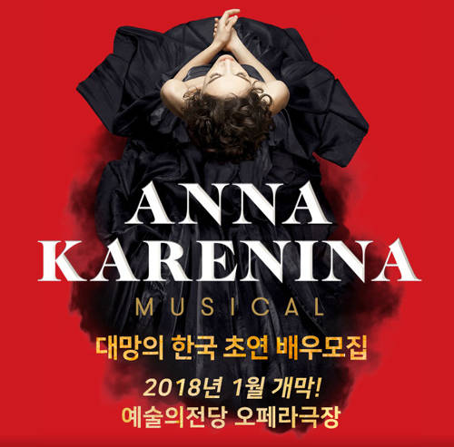 한편 뮤지컬 ‘안나 카레니나’는 예술의전당 오페라극장에서 2018년 1월 12일~2월 25일 공연된다. 알리나 체비크가 연출, 대본/가사를 율리 킴, 로만 이그나티예브가 음악, 이리나 코르네예바가 안무를 맡았다. 오디션 원서접수 마감은 배우는 6월 14일까지, 댄서는 25일까지다. 오디션에 관한 자세한 내용은 마스트엔 ㈜마스트엔터테인먼트 공식 홈페이지를 참조하면 된다.