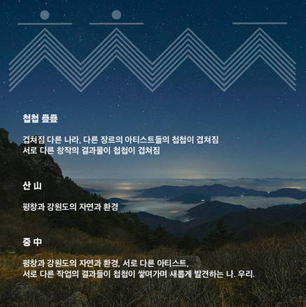 공모사업의 일환인 국제 레지던시 ‘첩첩산중 X 평창’은 9월 15일~10월 24일 평창 감자꽃스튜디오와 국립극장 달오름 극장, 행화탕 등에서 열린다. 첩첩산중 레지던시는 문화를 통해 사람과 사람, 국가와 지역, 전통과 현재를 연결하고 올림픽 정신에 입각한 평화와 화합, 문화의 다양성을 존중하는 프로젝트다. 올림픽에 참가하는 참가국의 음악, 무용, 시각 부문의 대표 아티스트들 23명이 40일 동안 평창과 강원지역을 투어하며 한국의 자연과 강원도의 문화유산을 경험하고, 그를 통해 받은 영감과 주제의식들을 공연·전시·영상·출판의 형태로 발표한다.