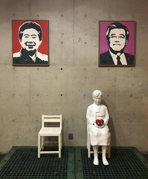 (위) 강영민, ‘디어 리더스(Dear Leaders)’. 캔버스에 아크릴릭, 73 x 91cm(each). 2017. / (아래) 강영민, ‘사랑의 처녀상(Statue of Love)’. FRP, 150 x 90cm. 2017.