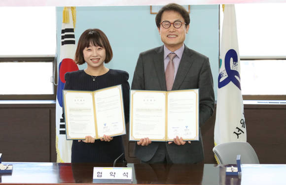 신시컴퍼니와 서울특별시교육청이 12월 4일 MOU를 체결한 가운데 신시컴퍼니 최은경(외쪽) 대표와 조희연 교육감이 참석했다.(사진=신시컴퍼니)