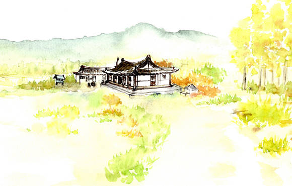 이상면 교수가 그린 윤동주 시인의 만주 용정 생가 수채화.