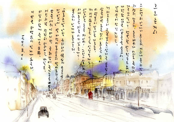 윤동주 시인의 1942년 작 '흐르는 거리' 시에 당시의 거리 모습을 배치한 시서화.