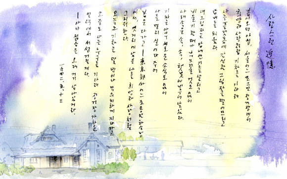 윤동주 시인의 1942년 작 '사랑스런 추억'에, 윤 시인이 기차를 기다렸던 역을 배경으로 그려넣은 시서화.