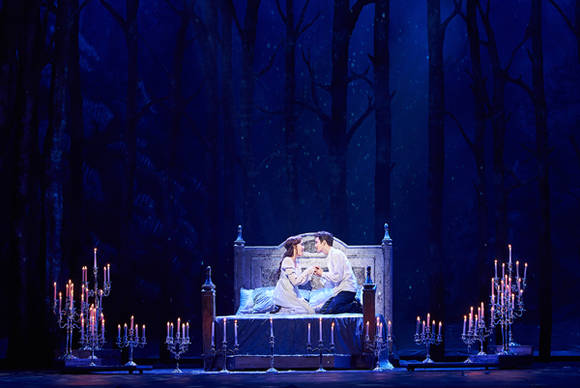 뮤지컬 ‘더 라스트 키스’에서 마리 역의 민경아(왼쪽), 루돌프 역의 수호가 열연 중이다. 이들을 둘러싼 촛불에 눈길이 간다.(사진=EMK뮤지컬컴퍼니)