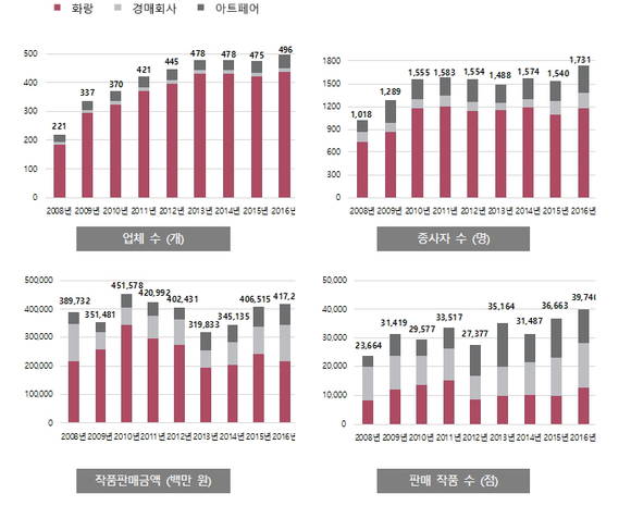 미술시장업체 수는 전체 496개, 종사자 수는 전체 1731명인 것으로 조사됐다. 이는 2015년 기준에 비해 각각 4.4%, 12.4% 증가한 것으로 미술 유통업계가 성장하고 있는 것으로 분석된다. 다만, 미술시장업체 수와 관련해서 화랑은 437개인 것으로 조사됐는데, 타 기관 조사(한국예술종합학교 한국예술연구소 분석)에 의하면 880개로 분석돼 미술시장의 현황 파악이 불명확한 것으로 보인다. 또한, 전속작가제도를 운영하는 화랑 121개 중에 서면계약을 진행하는 화랑은 59개(48.9%), 구두계약 36개(29.9%), 계약형태가 없는 화랑은 26개(21.2%)로 조사돼, 서면계약 체결률이 다소 낮음이 확인되었다.