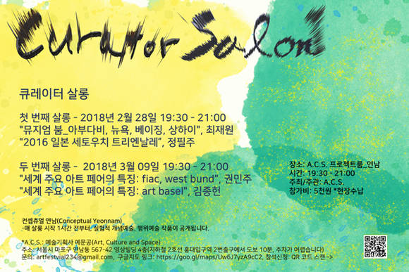 1월 2일 새롭게 연남동에 사무실을 마련한 예술기획사 예문공(A.C.S.)이 주최, 주관하는 이번 큐레이터 살롱은 미술계 생태계의 한 축인 예술기획자, 예술행정가들이 강연이란 포맷을 통해 대중과 보다 직접적인 교류에 나서기 위한 접점으로 마련됐다. 첫 강연회는 홍대 인근에서 2월 28일 오후 7시 30분, 두 번째 강연회는 3월 9일 열린다.