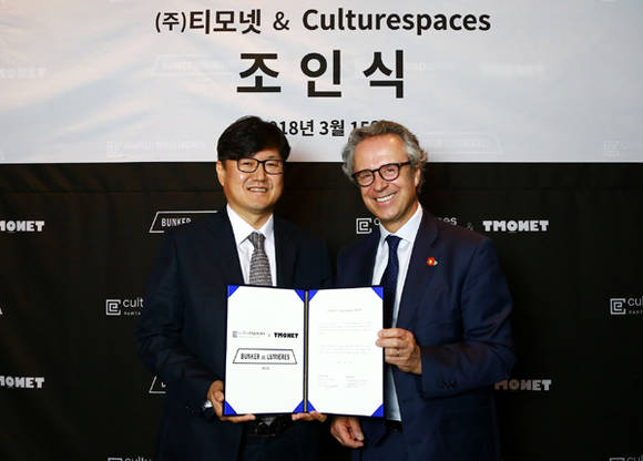 ㈜티모넷의 박진우 대표와 글로벌 미디어 아트 ‘아미엑스(AMIEX®)'를 선보인 프랑스 컬쳐스페이스社의 브루노 모니에 대표가 아미엑스®의 첫 해외 전시가 될 제주 ‘빛의 벙커’의 성공적인 개최를 위한 조인식을 가졌다.