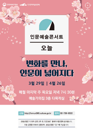 문화체육관광부(이하 문체부)가 한국문화예술위원회(이하 예술위)와 함께 개최하는 ‘인문예술콘서트 오늘’이 ‘변화’를 테마로 3월 29일 문화가 있는 주 목요일에 예술가의 집에서 꾸며진다.