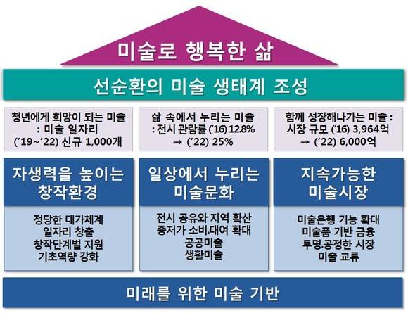 이에 문체부는 국민 누구나 사람 중심의 풍요롭고 아름다운 삶을 누릴 수 있도록 ‘미술로 행복한 삶’을 미술진흥 정책의 비전으로 정하고 창작-향유-유통이 선순환하는 미술 생태계를 조성하는 것을 목표로 제시했다.