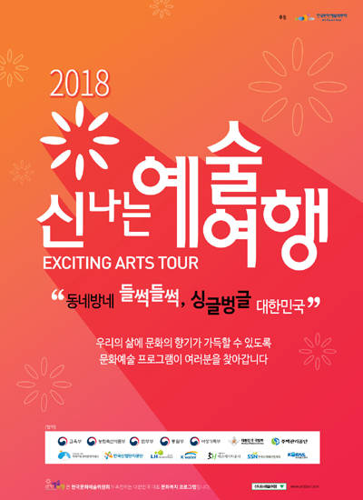 특히 ‘2018 신나는 예술여행’은 지역민이 하나가 될 수 있는 문화커뮤니티 기반을 마련하기 위해 지역적 수혜자들의 특성을 고려한 참여·체험형 문화예술 콘텐츠를 강화함으로써 문화사각지대를 최소화 해 나갈 계획이다.