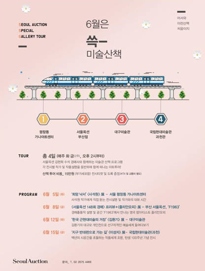 서울옥션이 전국의 미술관을 여행하는 ‘6월은 쓱- 스토리가 있는 미술산책’을 진행한다. 이번 프로그램은 전국에서 열리는 전시를 찾아 떠나는 아트투어다. 전시를 관람하며 서울옥션 김현희 수석경매사가 설명하는 작가와 작품에 대한 이야기도 들을 수 있다. 투어는 총 4일 일정으로 진행되며 서울 평창동 가나아트센터, 부산 서울옥션과 F1963, 대구미술관, 국립현대미술관(과천)을 방문한다.