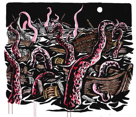 김명진의 ‘사람의아들’은 한지와 먹으로 어둡고 긴박하게 스테이징돼 있다. 이웃해 있는 우정수의 연작에 서려 있는 건조하면서도 동적인 긴장감은 기법적 장치를 통해 시간성을 가지면서 이를 자신의 드로잉 작업인 ‘폰타 델 코타 해전’(2016)에 서사적으로 연결한다.