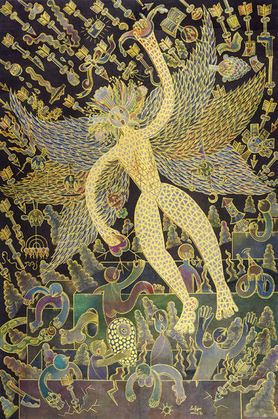 ‘모든 종교의 천사’는 서양 회화에 등장하는 천사를 고려불화의 선과 색채를 원용해 그린 작품이다. 특히 천사의 위치가 눈길을 끈다. 작가는 “동서양을 막론하고 제단화엔 신이 가운데 좌정하고, 천사는 위나 뒤로 밀린다. 그와 반대로 나는 천사를 가운데 배치하고, 동서양의 신들은 천사 날개의 품에, 폭탄과 화살들을 사방에 배치했다”며 “천사는 하늘과 땅, 삶과 죽음, 이승과 저승, 명사와 다른 품사들 사이의 조사나 전치사처럼 사이에 사는 메신저다. ‘모든 종교의 천사’에서는 주객과 색채, 내용을 모두 전도시켰다”고 설명했다.