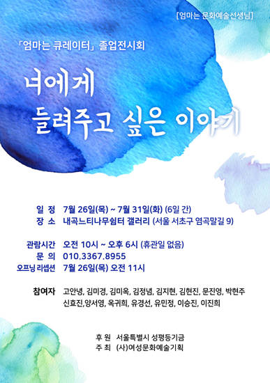‘너에게 들려주고 싶은 이야기’전이 7월 26~31일 서울 내곡동 느티나무쉼터 갤러리에서 열린다. 본 사업은 올해 서울시 성평등기금 당선사업이다. 본 ‘엄마는 큐레이터’ 사업은 ▲경력단절 여성들의 문화예술교육을 통한 삶의 질 향상 및 문화예술교육자로서 자질 계발 ▲지역공동체 내에서 활동할 수 있는 여성 문화예술교육자를 양성해 경력단절 여성들이 사회 경제 활동의 주체로서 자리매김 및 지역 공동체 활성화에 기여 ▲‘엄마표 문화예술 활동’을 통해 가정과 지역 사회가 함께 영위할 수 있는 행복한 문화생활 제시하는 것을 목적으로 한다.