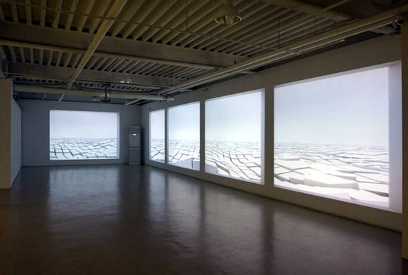 전시장에 들어서면 커다란 창 5개가 보이는데, 여기에 하얀색 파도가 넘실대는 바다가 펼쳐진다. 하지만 그 파도들을 자세히 바라보면 수많은 하얀색 육면체들이 움직이고, 겹쳐지고, 떨어지기를 반복한다는 것을 알 수 있다. 전시장 안쪽에는 끊임없이 반복되는 원의 움직임을 볼 수 있는 ‘원형공간(Circular space)’ 작품도 감상 할 수 있다. 이 모든 것들이 작가가 만들어 낸 가상풍경이다.