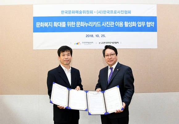한국문화예술위원회(위원장 직무대행 최창주, 이하 예술위)는 25일 통합문화이용권(문화누리카드) 이용자들이 전국 사진관을 통해 문화적 삶의 질을 높일 수 있도록 한국프로사진협회(회장 육재원)와 업무협약을 체결했다.