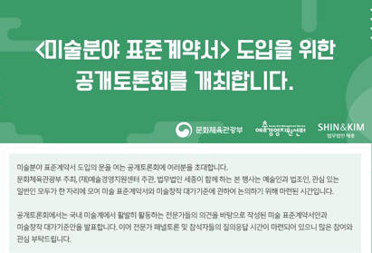 이번 토론회에서는 ① 작가 전속계약서 ② 화랑 전시 및 위탁판매계약서 ③ 미술관 등 전시계약서 ④ 미술·사진 모델 계약서 ⑤ 미술품 매매계약서 ⑥ 건축물 미술작품 계약서 등 6종의 계약 유형별 표준계약서 내용을 공유한다. 임상혁 법무법인 세종 변호사가 ‘표준계약서 연구안’ 주요 내용을 발표하고, 황승흠 국민대 교수가 표준계약서에 세부사항으로 포함될 ‘미술창작 대가기준안’을 발표한다.