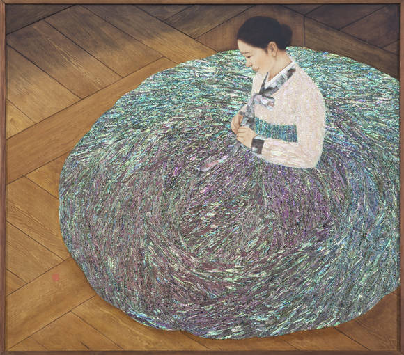 시간이 흘러 빛바랜 단청과 같이 채색해 고풍스러운 분위기를 자아내는 단청기법의 그림은, 작품의 바탕이 되는 나뭇결만큼 세월의 무게를 느끼게 해준다. 나무와 함께 긴 시간 이어온 자개 작업은 화면의 뒷면을 채색해 은은하게 비치는 전통 동양화 기법인 배채법으로 표현됐다.