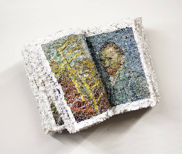 그는 옷이나 책이나 기본 형태를 훼손하지는 않는다. 표면만 두드리고 찢을 뿐이다. 무엇을 해체라고 했을까? 바로 책 속 글자. 두드리고 찢는 과정이 더해지면서 글자가 해체된다. 망치질로 물성만 남고 과거 스토리는 지워진다. 본래의 의미는 해체되지만 작가의 의도로 새롭게 재생된다. 책장에 천편일률적인 방식으로 가지런히 꽂혀 있던 책의 새로운 변신.