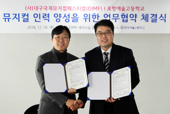 (사)대구국제뮤지컬페스티벌(이하 DIMF)이 18일 DIMF 사무국에서 포항예술고등학교와 상호발전을 위한 업무 협약식을 갖고 양해각서(MOU)를 체결했다.