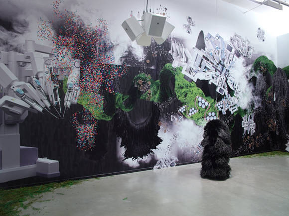먼저 부스 내·외부의 벽면 전체를 벽지 작업 ‘배양과 소진’(2018)이 장식한다. ‘배양과 소진’은 독일 그래픽 디자이너 마누엘 래더와의 협업으로 최근 프랑스 몽펠리에 라 파나세 현대예술센터에서 진행된 개인전 ‘시공 횡단’에서 처음 공개됐다. 프랑스 남부 일부 지역의 옛 명칭인 옥시타니아의 이교도적 문화 및 교육, 하이테크 산업이 융성한 지역 사회에 대한 일차적 조사를 바탕으로, 양파와 마늘, 의료 로봇, 구름, 불꽃, 벨 등 각양각색의 사물들을 예측 불허한 병치 및 배열로 구성한 작업이다. 이는 과거와 현재, 기술과 문화, 자연과 비자연적인 것(문명)이 융합된 유동적이고도 입체적인 환경을 구축했다.