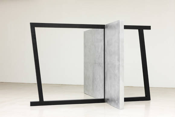 ‘고요한 벽체와 나’(2018)는 정갈하게 연마된 알루미늄 패널의 은빛 면, 사각 철 기둥의 검정색 선, 즉 서로 다른 것들이 결합된 구조를 통해 타자와 내가 공존하는 시공간을 이야기한다. 전시의 제목이기도 한 신작 ‘두 개의 날개와 낯선 자’(2018)는 서 있는 두 장의 대칭된 알루미늄 패널을 검은 선형 철 파이프가 붙들고 있는 작품으로, 이 역시 소외된 낯선 자를 포용하고자 하는 그의 철학을 보여준다. 그 외 ‘어느 평화로운 공간’(2018), ‘엄숙한 장소’(2018)까지, 주변과 소통하는 엄태정의 조각들은 관람객들을 작가가 마련해놓은 시공간 속으로 끌어들이며 새로운 우주를 만들어낸다.