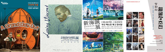 2017년 11월에 첫 개봉해 현재 재개봉중인 영화 ‘러빙 빈센트’ 역시 전시로 다시 찾아왔다. 지난해 11월 16일부터 역삼동 M컨템포러리에서 전시되고 있는 ‘러빙 빈센트’전은 미공개 원작과 함께 영화 속 장면 중 엄선된 125점의 작품을 전시한다. 역시 영화콘텐츠로 전시장을 찾은 작품은 일본 애니메이션 ‘너의 이름은’을 히트시킨 감독 ‘신카이 마코토’전이다. 빛의 마술사라 불리는 그의 영상이 탄생되기까지 과정과 원화 등으로 또 한 번 관객들을 불러 모으고 있다. 지난해 12월 14일 부산 벡스코 제2전시장에서 개막했다.