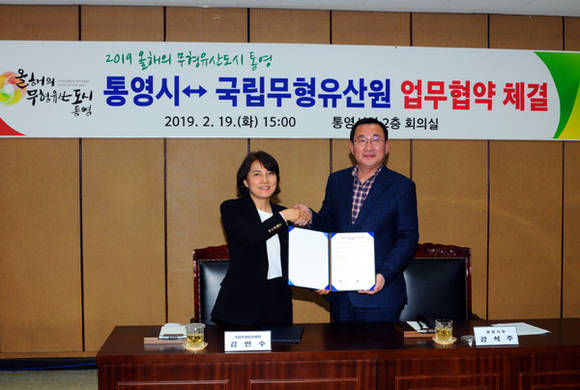 문화재청 국립무형유산원(원장 김연수)은 ‘2019 올해의 무형유산도시’로 선정한 통영시(시장 강석주)와 2월 19일 통영 시청에서 통영의 무형유산 활성화를 위한 협력 사업 업무협약(MOU)을 체결했다.
