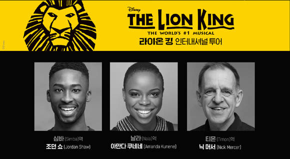 먼저 주인공 심바 역에는 영국을 주무대로 ‘캣츠’ ‘미스 사이공’ ‘모타운’ 등의 대형 뮤지컬 작품과 연극, 영화 등에 출연한 웨스트 엔드 배우 조던 쇼가 합류한다. 날라 역은 16세부터 프로 데뷔를 했으며 ‘라이온 킹’ 앙상블에서 날라의 커버, 그리고 주역까지 거머쥔 아만다 쿠네네가 맡는다.