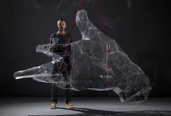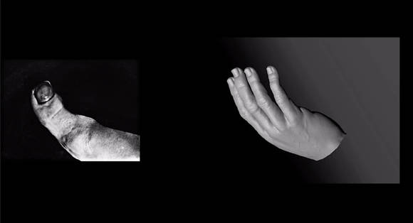 한편, 조각 ‘이성의 속살’은 원본 이미지를 3D 모델링한 뒤 여기서 파생된 픽셀 면을 내·외부를 그대로 드러내는 투명아크릴수지 다면체로 균질하게 조합한 작업이다. 고대 ‘콘스탄티누스 거상’의 검지를 든 손이 작업의 모티브로 작용했다.