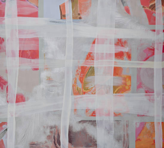 전시 제목과 동명의 회화인 ‘이성의 속살’은 토비 지글러를 대표하는 알루미늄 페인팅 시리즈 중 하나로, 화면 위 언뜻 보이는 첫 번째 레이어에는 구상적 신체 형상들이 자리한다. 작가는 인터넷 구글링을 통해 찾은 르네상스, 바로크 예술품 속 손발 도상의 저해상도 이미지를 디지털 렌더링으로 조작해, 이를 캔버스 면이 아닌 알루미늄 판 위에 오일 페인팅으로 얇게 도포했다.