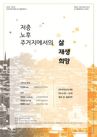 한국건축가협회(회장 강철희) 도시재생위원회(위원장 김선아)는 3월 28일 KB락스타 청춘마루에서 ‘저층 노후 주거지에서의 삶, 재생, 희망’을 주제로 ‘도시 재생 세미나 : 깨우는 건축, 살아난 도시’를 연다. 본 세미나는 건축가와 다양한 도시 전문가 그리고 시민들이 도시를 살리는 데 무엇을 할 수 있는지 함께 찾아보고자 하는 의미에서 기획됐다.