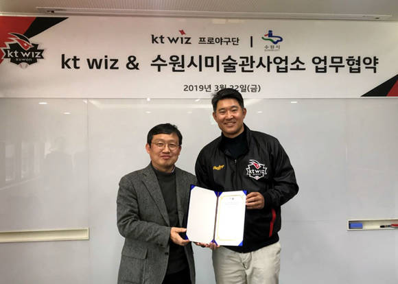 수원시미술관사업소(소장 김찬동)과 kt wiz 프로야구단(단장 이숭용)은 3월 22일 kt wiz 파크에서 지역문화예술과 프로야구 활성화 사업의 발전을 위한 MOU를 체결했다.