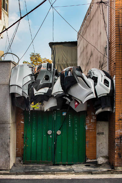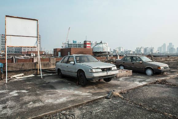 전시는 크게 중고차 부품 거리의 집적된 오브제와 장안평 중고차 매매상가, 답십리 부품상가 일대의 풍경 두 개의 유형으로 분류된다. 정비소와 부품유통업체들이 즐비한 블록 맞은편에 연립주택과 대단지 아파트가 들어선 낯선 풍경부터, 지붕 위에 빼곡히 쌓인 부품들과 거대한 생물의 장기처럼 보이는 내연기관의 모습까지…. 사진가 정정호는 오랫동안 문화적 가장자리였던 장안평이 품고 있는 내러티브를 착실히 담아냈다. 풍경들은 한 문명이 끝나고 난 폐허의 느낌마저 든다.