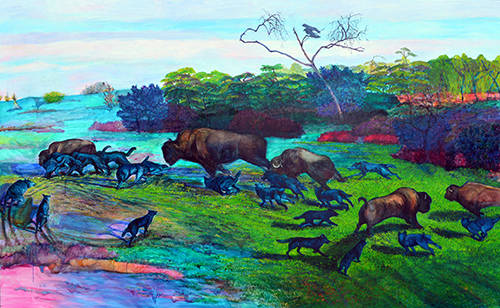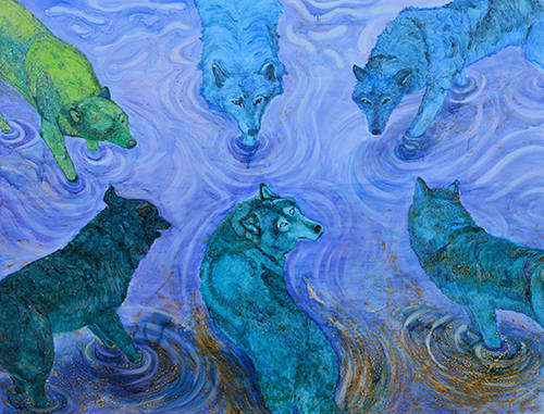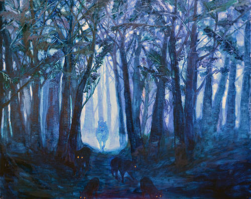 여러 빛깔이 뒤섞인 푸른색은 몽환적인 느낌으로 늑대의 삶을 더욱 찬란하게 묘사한다. 문주혜 큐레이터는 “옅게 켜켜이 쌓인 물감은 푸른 늑대가 가진 신화적인 요소를 강조한다”며 “늑대는 연극처럼 캔버스를 무대로 자신의 삶을 연기한다. 장면마다 사나운 모습, 우수에 찬 모습 등 팔색조로 연기하는 늑대는 차가운 포식자이기도 하며 자연을 수호하는 영물처럼 보이기도 한다”고 밝혔다.