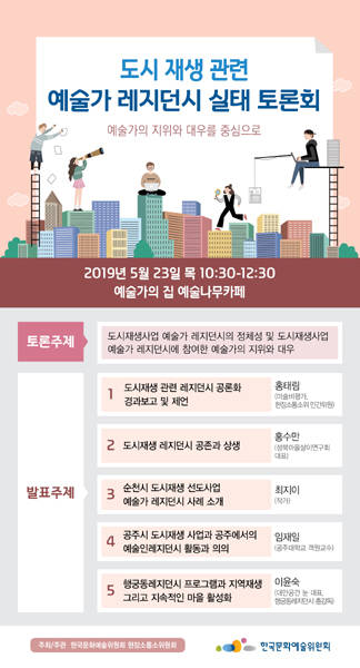 5월 23일 예술가의 집(예술나무까페)에서 열리는 ‘도시재생 관련 예술가 레지던시 실태 토론회: 예술가의 지위와 대우를 중심으로’는 한성대 레지던시 안건을 담당한 홍태림 현장소통소위 민간위원이 기조발제자 및 사회자를 맡았다. 토론자로는 홍수만(성북마을살이연구회 대표), 최지이(순천시 도시재생 선도사업 예술가 레지던시 전 입주작가), 임재일(사회문화예술연구소 오늘 소장, 국립공주대학교 객원교수), 이윤숙(조각·설치예술가, 수원 행궁동 레지던시 총감독, 대안공간 눈 대표, 마을기업 행궁솜씨 대표)이 참여한다.