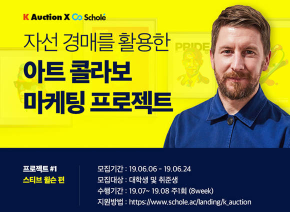 스콜레는 6월 24일까지 케이옥션 프로젝트를 위한 팀원 모집을 진행한다. 지원 동기 등을 중심으로 1차 서류 심사 후 온라인 인터뷰를 통해 최종 선발된 팀원은 7월 초부터 8월 중순까지 약 8주 동안 오리엔테이션 및 과제 수행 과정을 거쳐 최종 결과물을 발표하게 된다. 자선경매, 미술, 사회공헌, 홍보, 마케팅 등에 관심 있는 대학생이나 취준생, 관련 업계 종사자를 비롯해 연령대 상관없이 누구나 프로젝트에 지원할 수 있다.