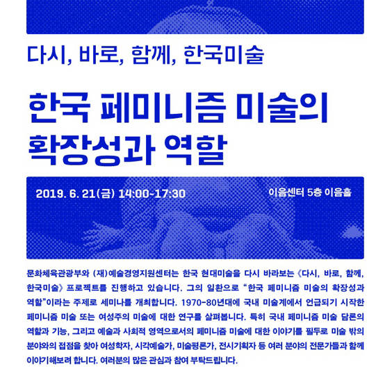 문화관광체육부와 (재)예술경영지원센터는 2017년부터 한국미술 다시보기 프로젝트를 진행해오고 있다. ‘다시, 바로, 함께, 한국미술’은 아카이빙과 자료 검토, 그리고 재발견이라는 기조 아래 객관적인 한국 현대미술사 다시 보기를 세미나를 통해 제안하는 프로젝트다. 이번에 열리는 ‘한국 페미니즘 미술의 확장성과 역할’은 4개월마다 개최되는 정기 연구 세미나와 더불어 국내 페미니즘 미술 담론에 초점을 맞춰 확장 가능성을 진단해 보는 자리다.