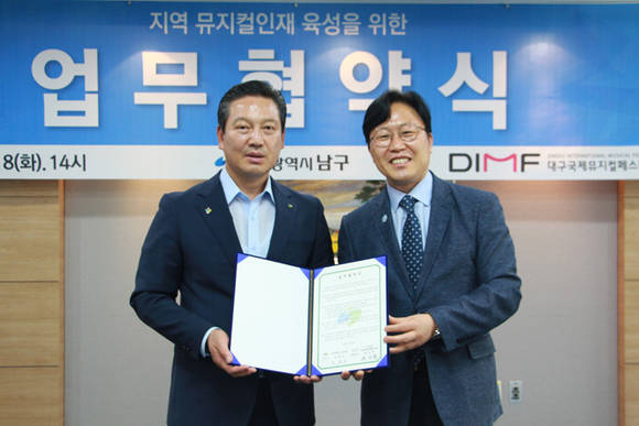 (사)대구국제뮤지컬페스티벌(이하DIMF)이 대구광역시 남구청(이하 남구청)과 6월 18일 남구청에서 MOU를 체결하고 뮤지컬 인력 양성 프로그램 활성화 및 콘텐츠 개발 네트워크 구축에 협력을 합의했다.